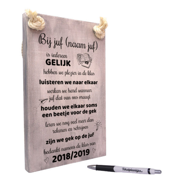 Een persoonlijk bedankje voor de juf wat prachtig in de klas kan hangen. Dat is deze tekst op hout, en hier zal de juf zeker blij mee zijn! Zet de naam van de juf op het hout en het jaar om dit tekstplankje helemaal persoonlijk te maken.
